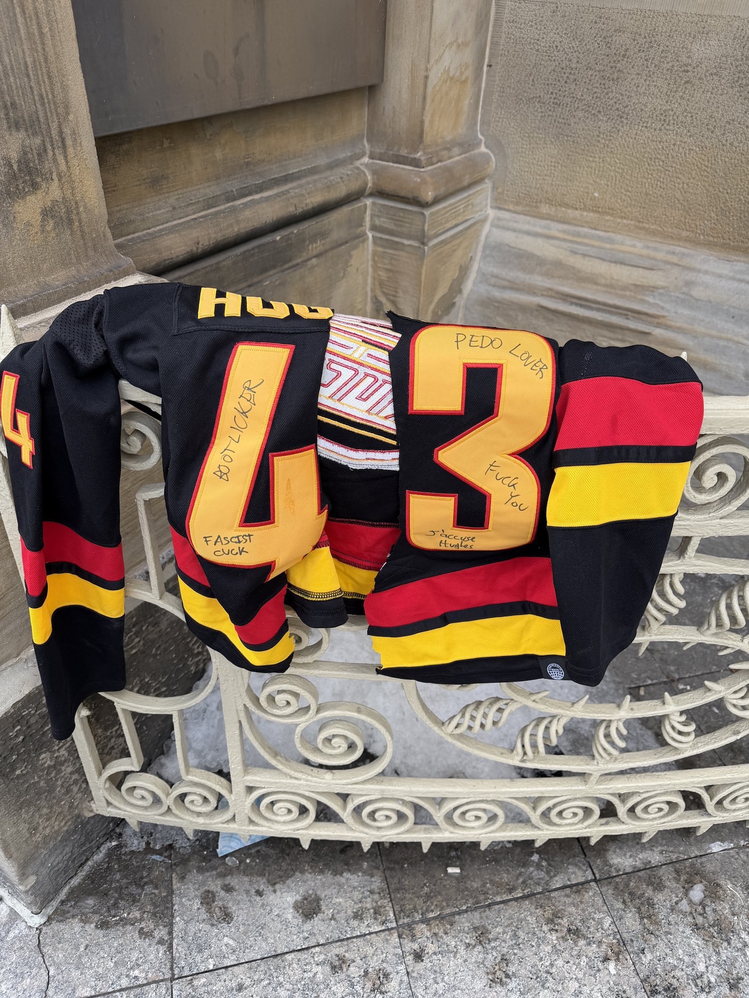 As the Team USA men’s hockey team stays embroiled in controversy, one apparently disgruntled fan has left a defaced Quinn Hughes jersey at the Hockey...