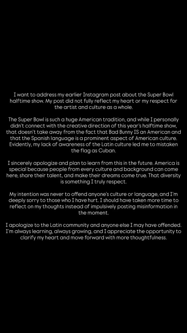 Taylor Armstrong has apologized for her controversial comments about Bad Bunny’s Super Bowl LX halftime performance. The Real Housewives of Beverly Hi...