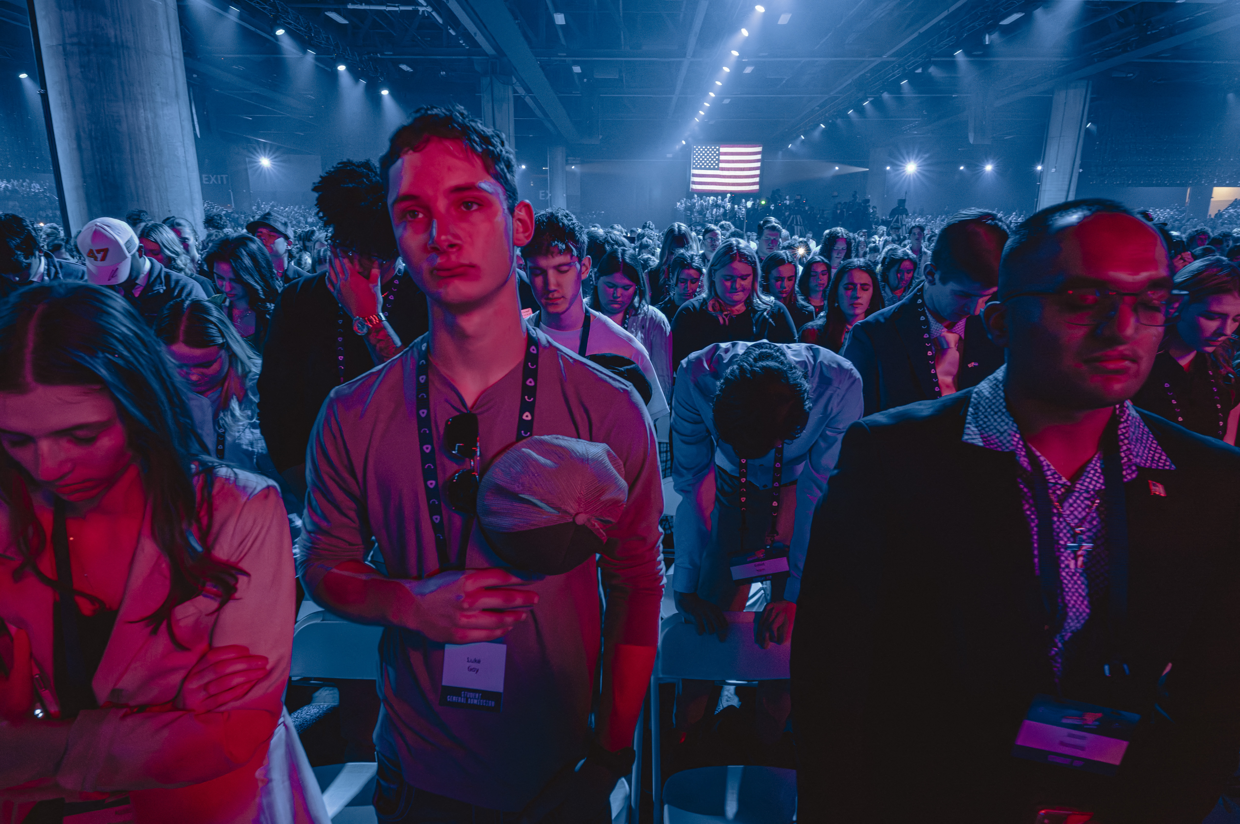 Attendees pray with Pastor John Amanchukwu (out of frame) as he leads the daily prayer at Turning Point's annual AmericaFest conference, in reme...