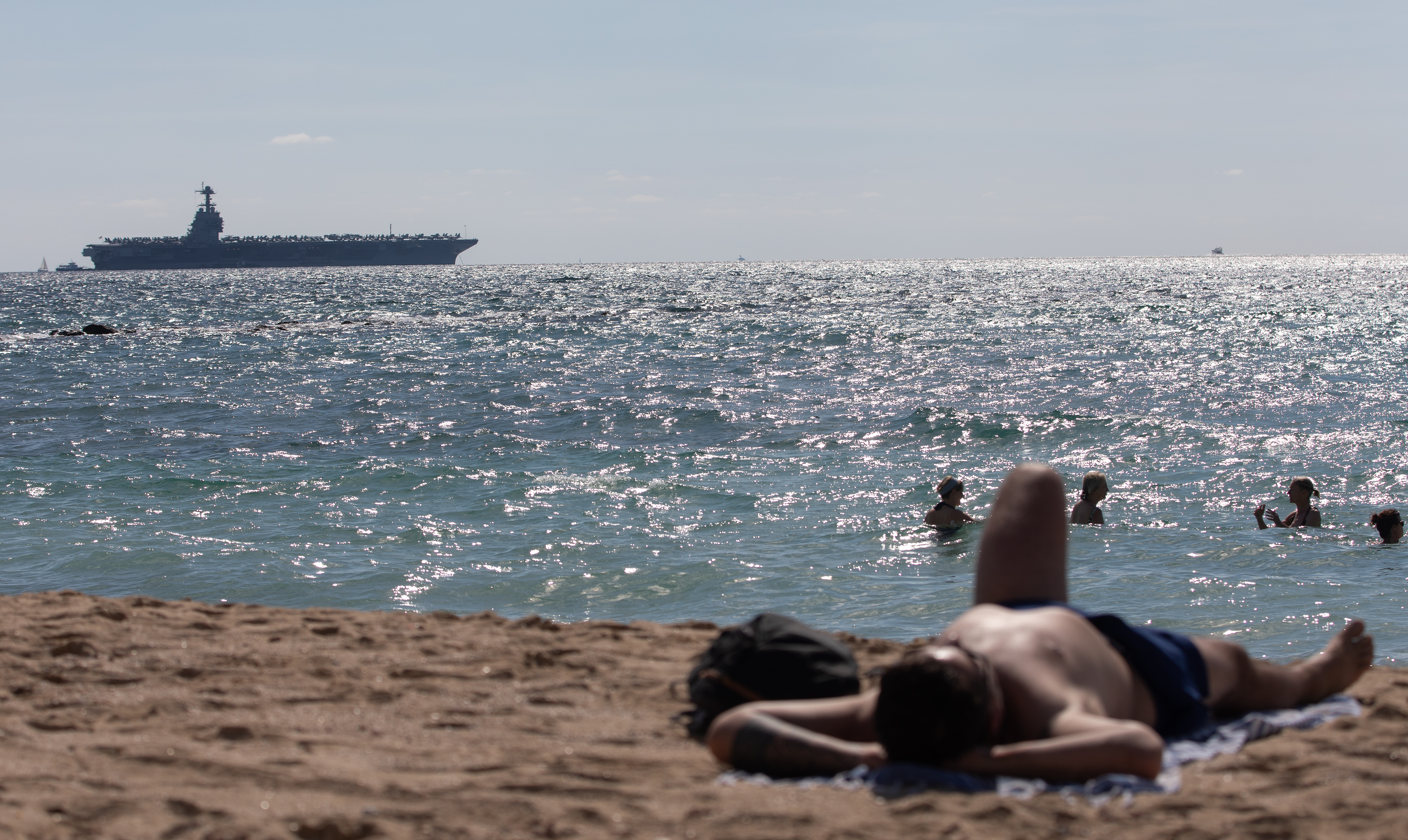 The US aircraft carrier USS Gerald R. Ford is seen from a beach in Mallorca, Spain on October 4, 2025. | Clara Margais/picture alliance via Get...
