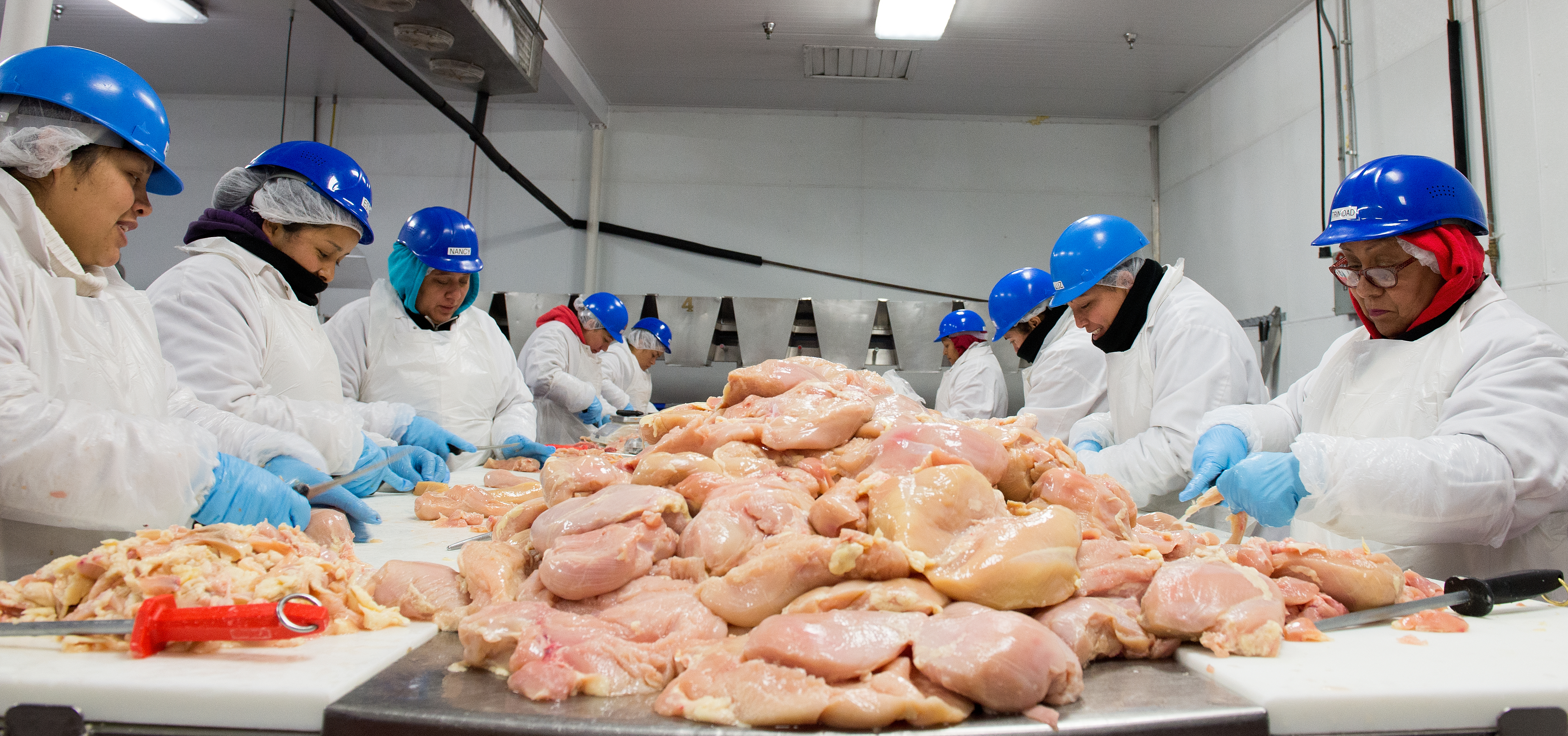 Poultry workers cut up chicken carcasses in a chilled room. | Leonard Ortiz/Digital First Media/Orange County Register via Getty Images Last w...