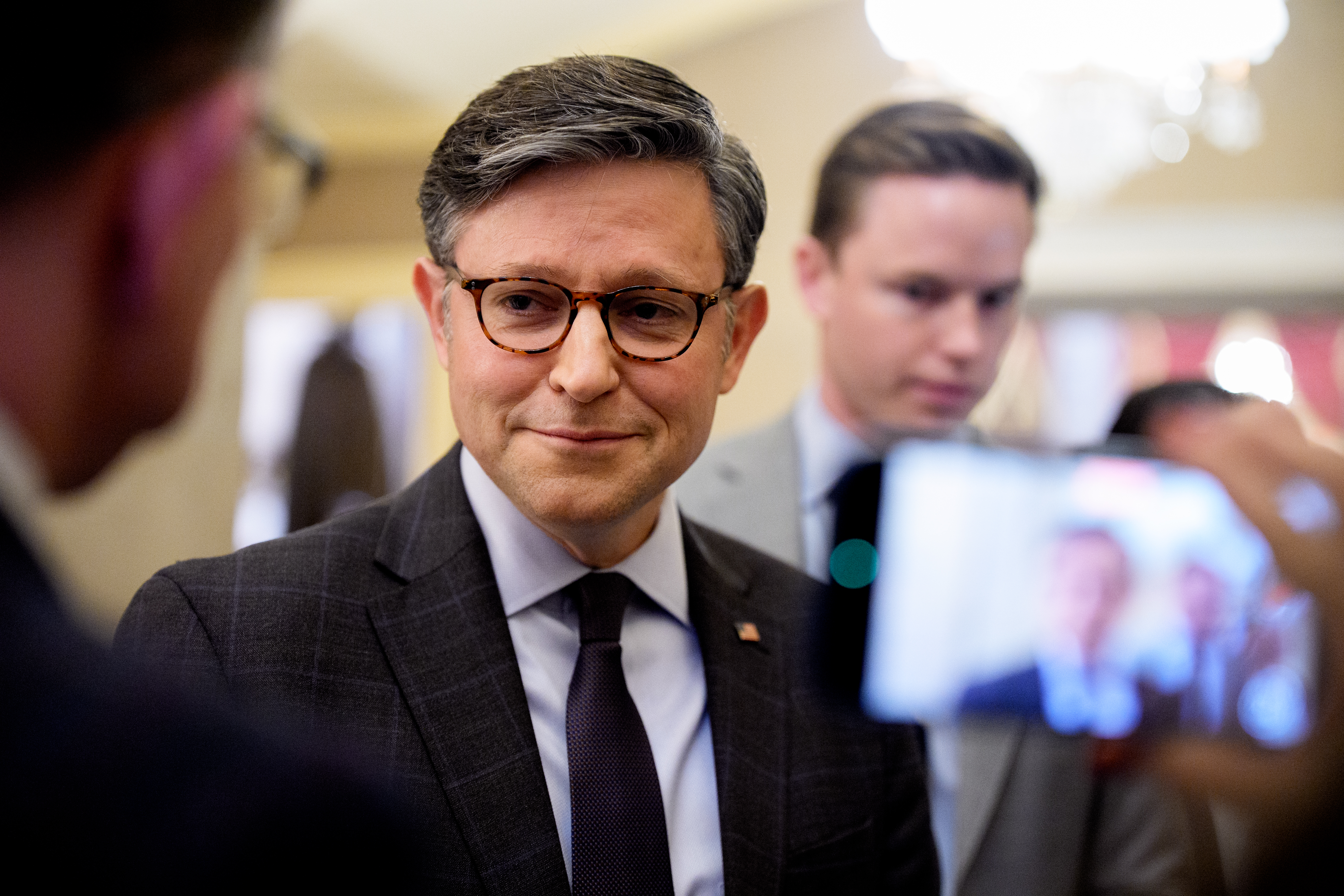 House Speaker Mike Johnson (R-LA) takes a question from a reporter at the US Capitol Building on December 3, 2025, in Washington, DC. | Andrew H...