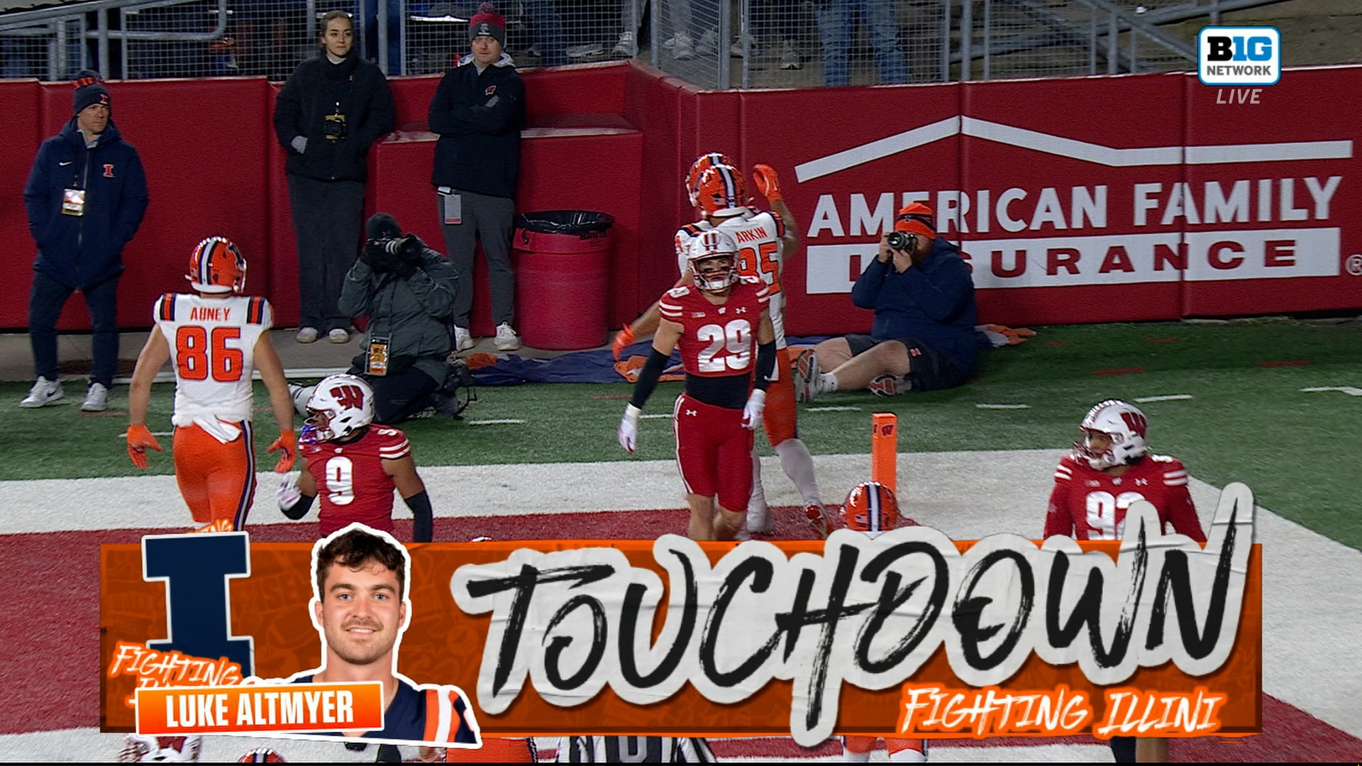 Luke Altmeyer rushed 12 yards into the end zone, bringing the Illinois Fighting Illini even with the Wisconsin Badgers.