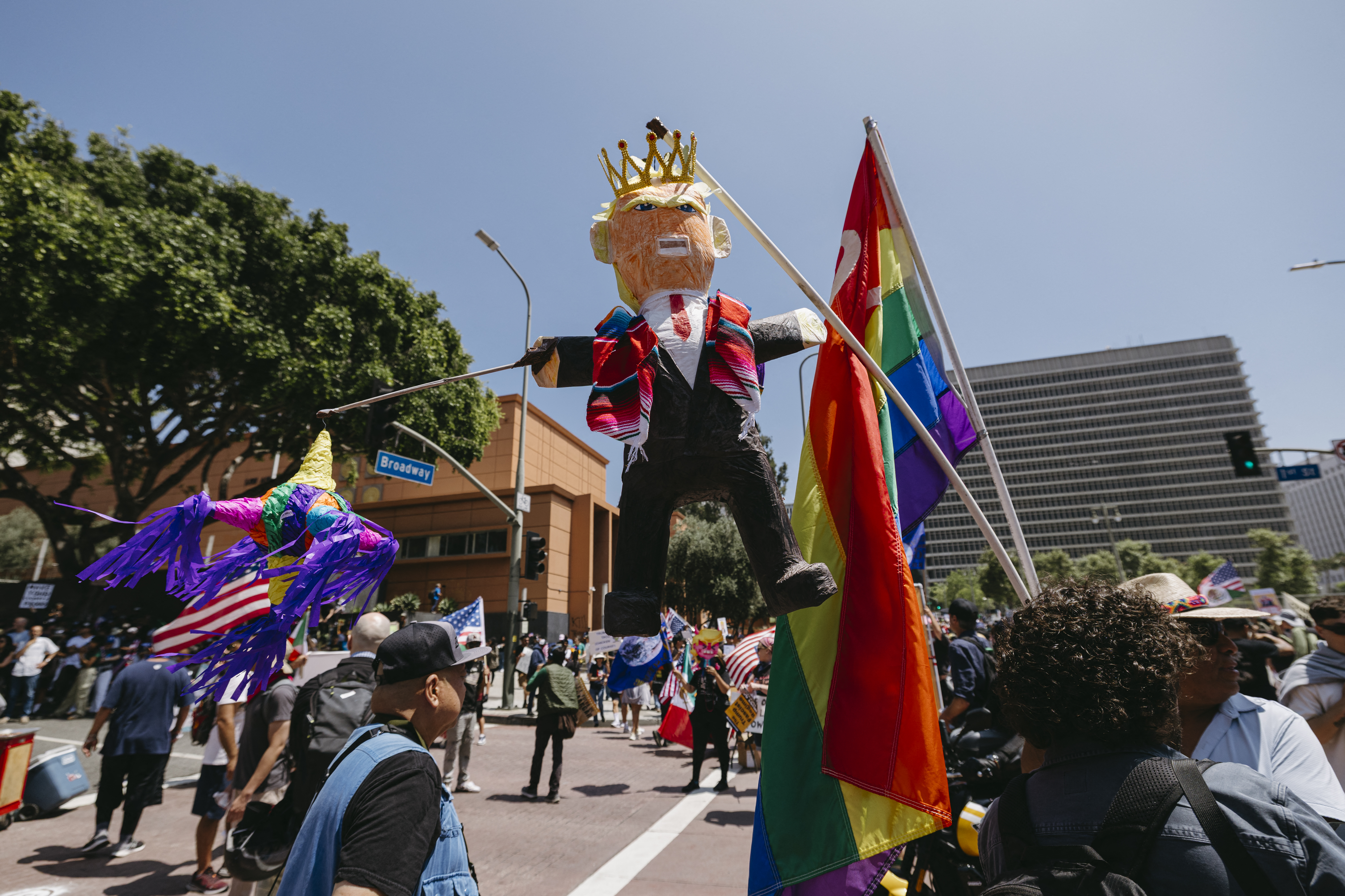 Protesters display an effigy of Donald Trump wearing a crown during a rally in Los Angeles on June 14, 2025. | David Pashaee/Middle East Images/...