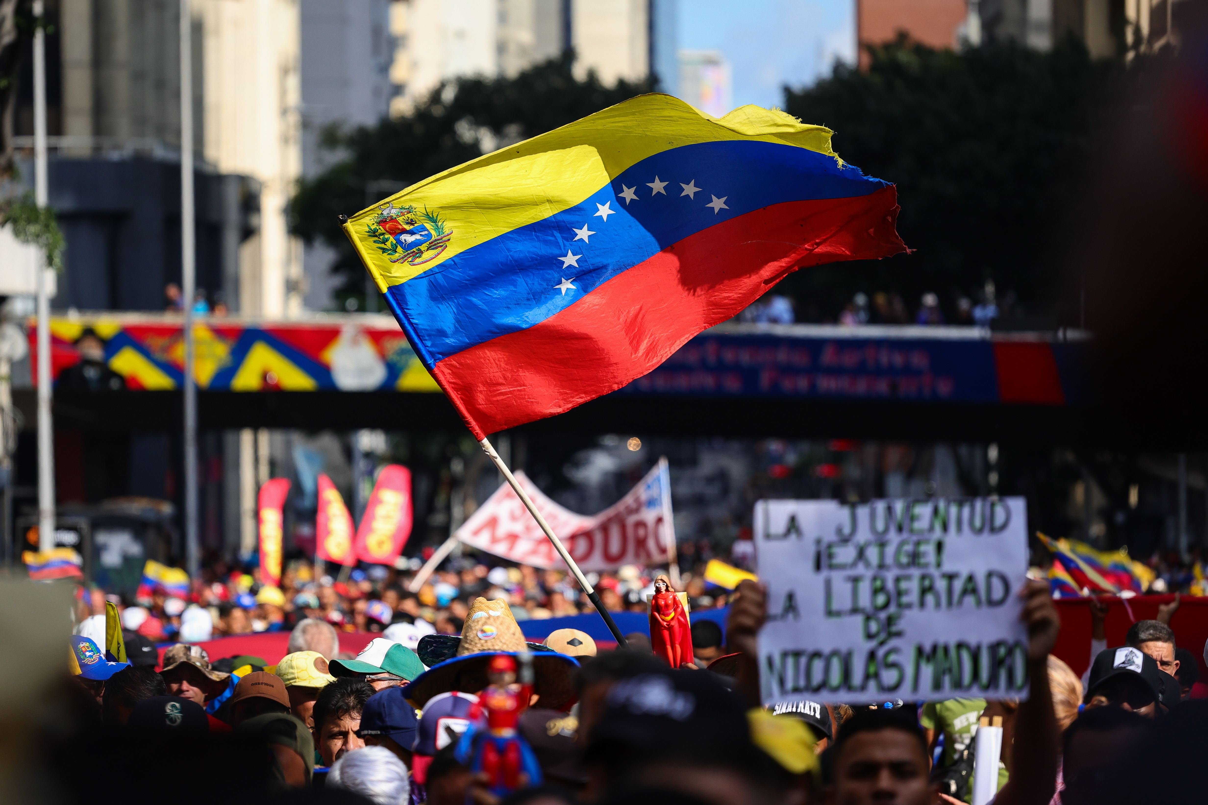 A demonstrator holds US and Venezuelan flags during a rally in Katy, Texas, on January 3, 2026. | Mark Felix/Bloomberg via Getty Imagesetty Imag...